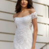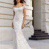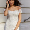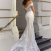Nuestro vestido de novia Dimitra fue diseñado pensando en la elegancia y el romanticismo. El suave escote redondo acentúa el corpiño transparente con corsé que presenta aplicaciones bordadas esmeriladas perfectamente colocadas. La sensual silueta de sirena abraza bellamente el cuerpo en romántico encaje Chantilly, y la falda godet y la cola transparente con adornos de encaje le dan al vestido un toque mágico.