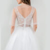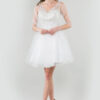 Decorado con un brillo deslumbrante, este vestido corto de tul presenta una espalda en V abierta y transparente. El corpiño es ajustado hasta llegar a la cintura, y la falda se ensancha en una hermosa línea A.